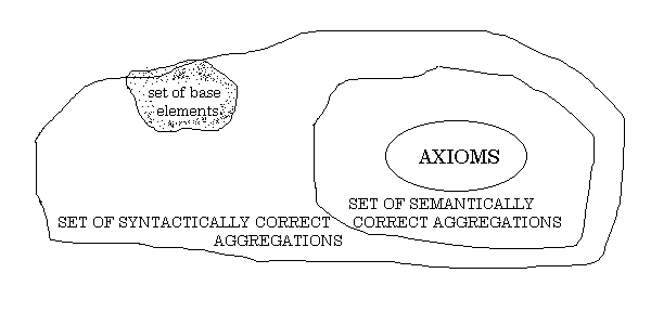 P(.) on T}, A = {semantically correct elements of P(T)}, and R